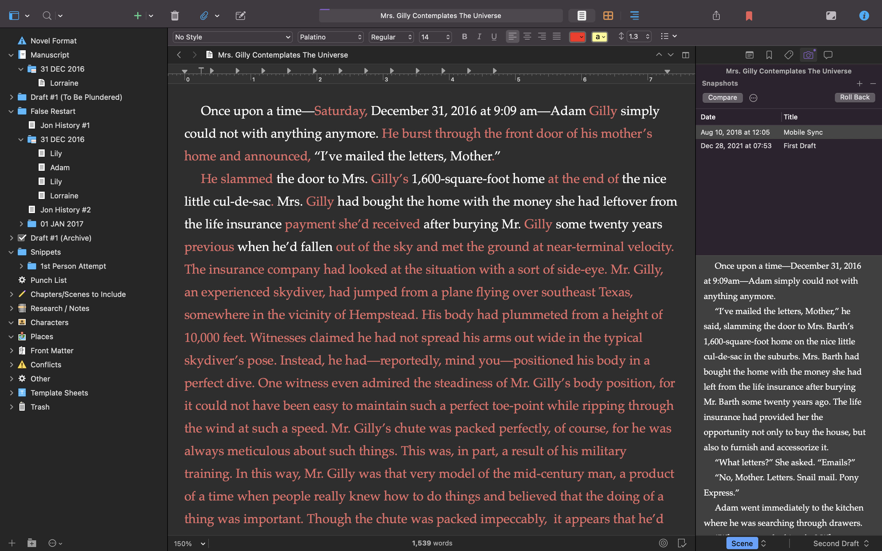 If you don’t want to pay for Scrivener (a one-time thing) or Ulysses (a subscription), there are other options. Find something that works. But remember that the artist needs tools, so get some good tools…even if you have to pay for them!