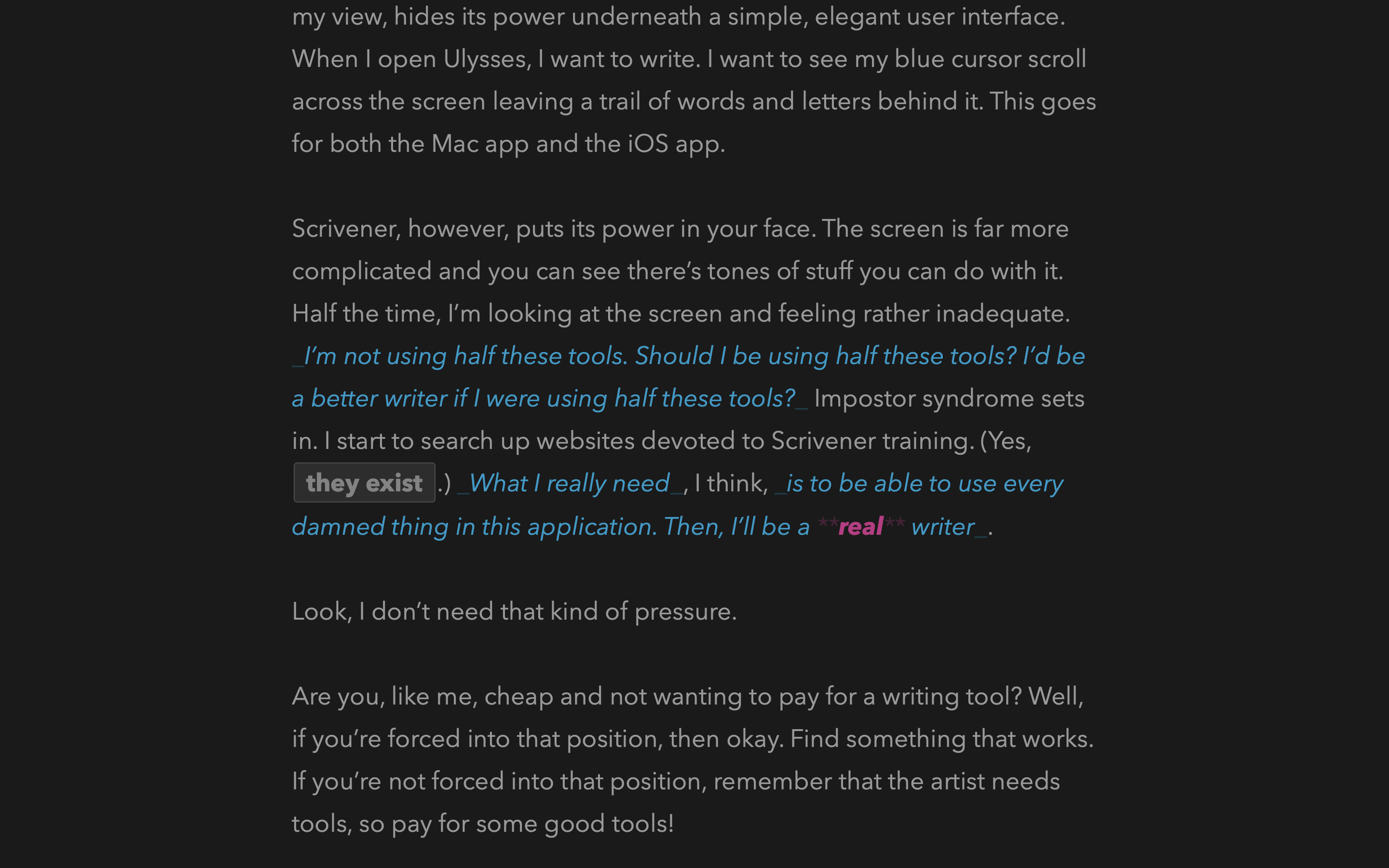 For me, Scrivener and Ulysses are both powerful tools. Ulysses, in my view, hides its power underneath a simple, elegant user interface. When I open Ulysses, I want to write. I want to see my blue cursor scroll across the screen, leaving a trail of words and letters behind it. This goes for both the Mac app and the iOS app.